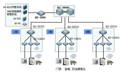 辦公大樓智能建筑網絡包含業務辦公網和智能化設備網。由于部分業務具有一定的機密性,因此需要考慮安全隔離與訪問控制,建議采用銳捷網絡應用安全域解決方案。